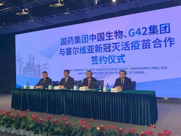 當(dāng)?shù)貢r間7月12日,中國國藥集團(tuán)、塞爾維亞政府、阿聯(lián)酋G42集團(tuán)關(guān)于《新冠疫苗合作生產(chǎn)備忘錄》簽約儀式在線上舉行。塞爾維亞總理布爾納比奇、中國駐塞大使陳波出席簽約儀式。
