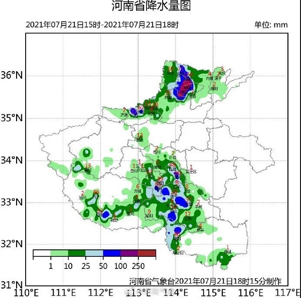 根據(jù)氣象部門報告,7月21日15時至21日18時:安陽、鶴壁、駐馬店、信陽局地出現(xiàn)大暴雨,新鄉(xiāng)、焦作、洛陽、平頂山、漯河、南陽局地出現(xiàn)暴雨,許昌局地出現(xiàn)大雨。有108個雨量站降水量超過50毫米,其中大于100毫米的有36個,最大降水量出現(xiàn)在鶴壁市淇縣思德238.9毫米。最大小時雨強出現(xiàn)在鶴壁市淇縣思德98.1毫米。