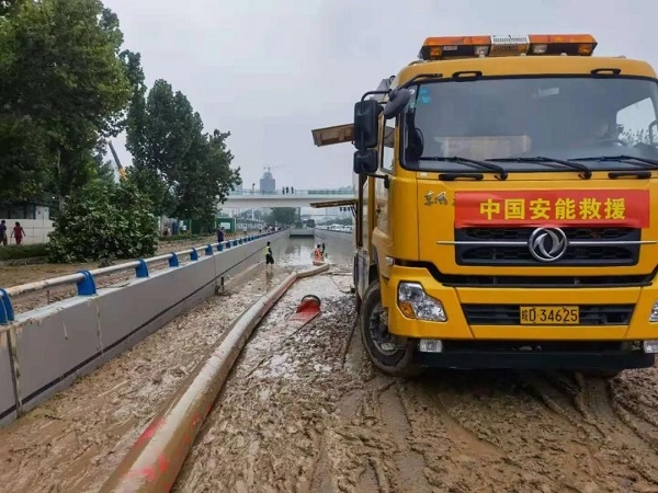 ▲ 中國安能唐山救援基地1臺龍吸水、35名救援人員,7月21日1時40分開始在京廣北路隧道由南往北閘道口東側(cè),以每小時約3000方的排量,展開抽排水救援。截至7月21日下午5時40分,已完成抽排水1.2萬方,該閘道口路面已露出8米,水位下降1米。