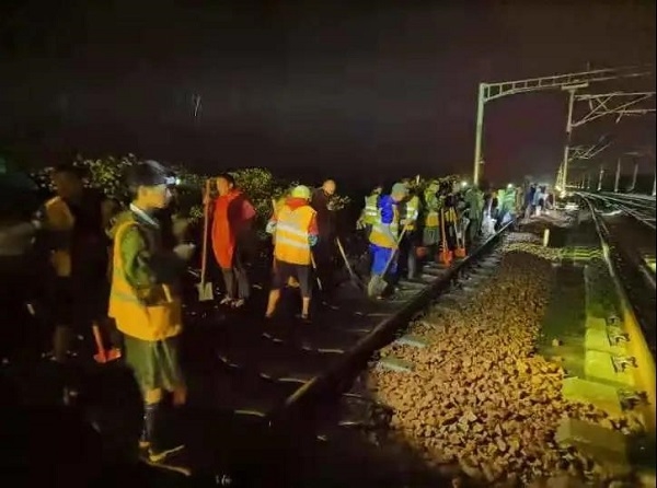 ▲截至7月21日10時,中國通號電氣化局共有約680余名員工冒雨先后在隴海線、京廣線、鄭西高鐵等水害現(xiàn)場,組織16臺大型搶險機械,通過對線路拋填片石、清理坍體、打樁堆碼編織袋、回填陷穴等措施,對線路、供電、接觸網(wǎng)、信號等設備進行搶修,確保線路安全。