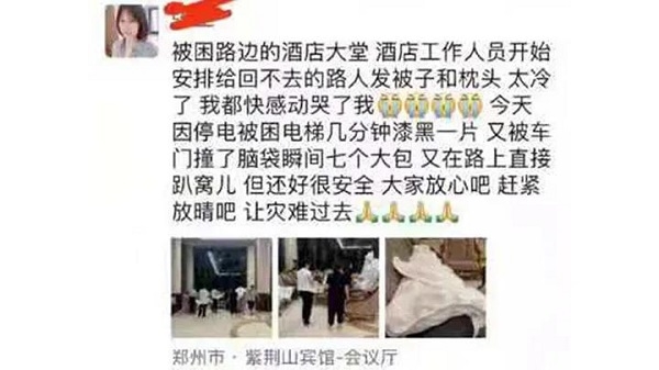 ▲災害降臨,中國融通旅發(fā)鄭州地區(qū)的賓館安置滯留群眾??头勘瑵M后,緊急在大廳設置臨時安置點,提供熱水、簡餐、被子等服務,安置900余人。同時,全力協(xié)助轄區(qū)做好搶險排水,派出20多人攜帶排污泵參與搶險,并設置警戒線,防止人員和車輛涉水通行。此外,鄭州豫鷹賓館共登記客房116間,接待容留市民223人次。