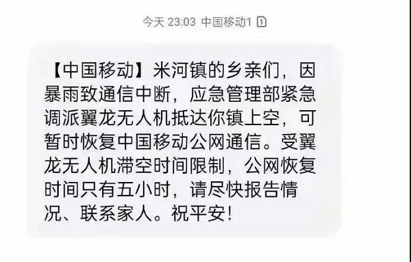 ▲“翼龍”-2H應急救災型無人機系統(tǒng)是航空工業(yè)打造的應急通信國家力量,可定向恢復50平方公里的移動公網(wǎng)通信,建立覆蓋15000平方公里的音視頻通信網(wǎng)絡。針對災區(qū) “三斷”情況,通過融合空中組網(wǎng)、高點中繼等技術,實現(xiàn)圖像、語音、數(shù)據(jù)上下貫通橫向互聯(lián)。翼龍-2H應急救災型于下午14:22從安順機場起飛,在河南上空執(zhí)行這個五到六小時的偵察和中繼任務。18:21進入任務區(qū)。當“翼龍”在頭頂飛過,為鄉(xiāng)親們搭建通信“生命線”!