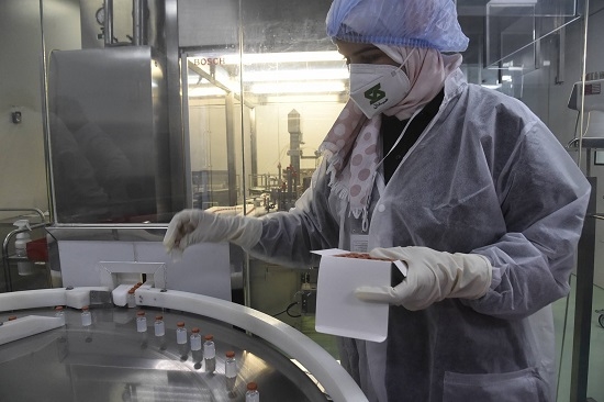 9月29日,在阿爾及利亞東部城市君士坦丁,一名賽達爾醫(yī)藥集團的工作人員查看生產(chǎn)的新冠疫苗。阿爾及利亞與中國合作生產(chǎn)新冠疫苗項目于9月29日正式投產(chǎn)。(新華社發(fā))
