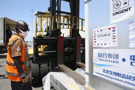 9月18日,工作人員在科特迪瓦阿比讓國際機場轉(zhuǎn)運中國國藥集團供應(yīng)的新冠疫苗。(新華社發(fā) 伊萬·宋 攝)