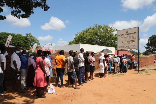 2021年3月24日,民眾在津巴布韋維多利亞瀑布城一家醫(yī)院門(mén)口排隊(duì)等待接種中國(guó)國(guó)藥集團(tuán)新冠疫苗。新華社發(fā)(陳雅琴 攝)