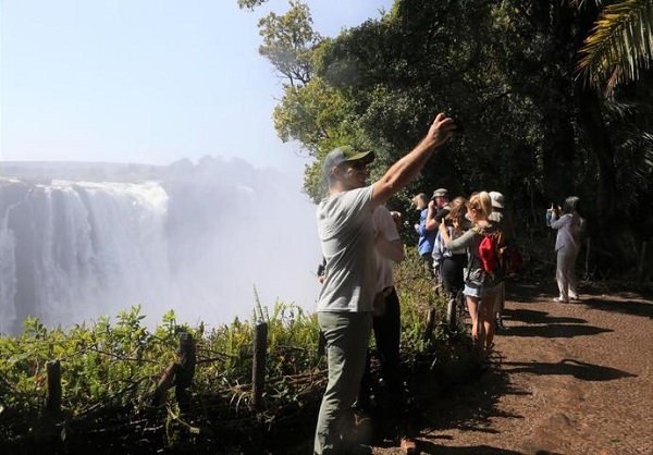 2019年7月18日,游客在津巴布韋一側(cè)游覽維多利亞瀑布。新華社發(fā)(陳雅琴 攝)