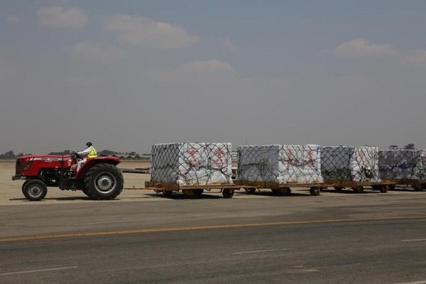 2021年9月26日,工作人員在津巴布韋首都哈拉雷的羅伯特·穆加貝國(guó)際機(jī)場(chǎng)轉(zhuǎn)運(yùn)中國(guó)援助的新冠疫苗。當(dāng)天下午,中國(guó)援助津巴布韋的第四批新冠疫苗運(yùn)抵首都哈拉雷。新華社發(fā)(陳雅琴 攝)