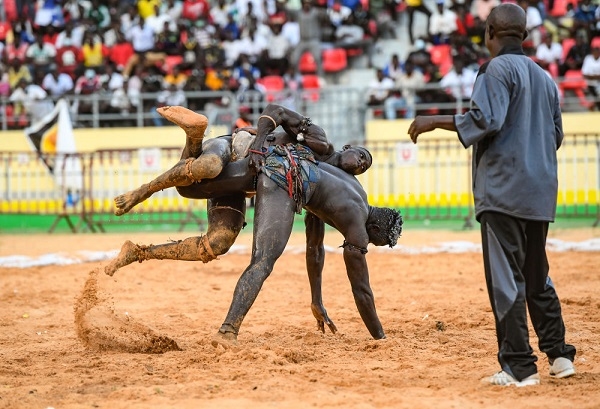 11月21日,在塞內(nèi)加爾首都達喀爾,選手在塞內(nèi)加爾競技摔跤場內(nèi)比賽。