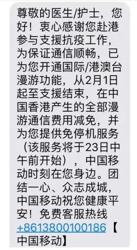 為支持內(nèi)地醫(yī)療隊(duì)援港工作,中國電信、中國聯(lián)通、中國移動(dòng)組建專門服務(wù)保障團(tuán)隊(duì),為援港醫(yī)療隊(duì)全額減免赴港期間的全部跨境漫游通信費(fèi)用,并提供免停機(jī)服務(wù)以及7x24小時(shí)客服熱線優(yōu)先接入服務(wù),為援港醫(yī)療隊(duì)送上“定制版溫暖”。