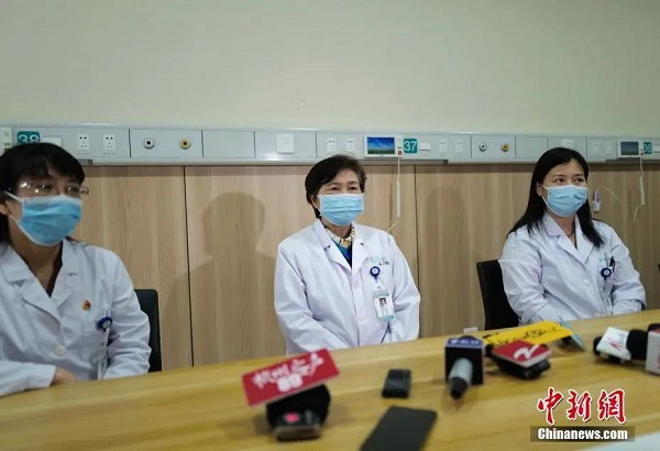 5月1日,中國工程院院士李蘭娟(中)介紹奧密克戎變異株新冠病毒滅活疫苗臨床研究情況。中新社記者 張煜歡 攝