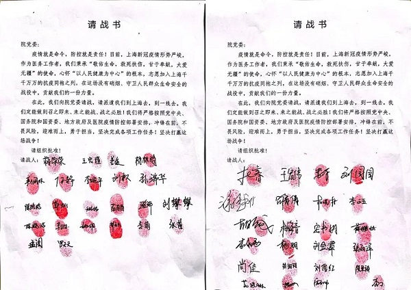 ▲中國電建黃河醫(yī)院醫(yī)護(hù)人員支援上海抗疫請戰(zhàn)書