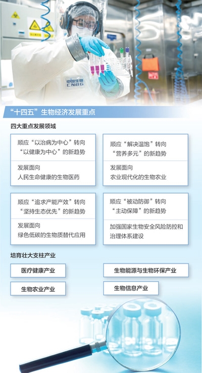 日前,《“十四五”生物經(jīng)濟(jì)發(fā)展規(guī)劃》(以下簡稱《規(guī)劃》)正式印發(fā)。作為我國首部生物經(jīng)濟(jì)五年規(guī)劃,《規(guī)劃》提出加快發(fā)展生物技術(shù)和生物產(chǎn)業(yè),讓生物經(jīng)濟(jì)成為推動高質(zhì)量發(fā)展的強(qiáng)勁動力,明確要培育壯大醫(yī)療健康、生物農(nóng)業(yè)、生物能源與生物環(huán)保、生物信息等支柱產(chǎn)業(yè)。生物經(jīng)濟(jì)支柱產(chǎn)業(yè)前景如何,怎樣培育壯大?記者對相關(guān)企業(yè)和專家進(jìn)行了采訪。