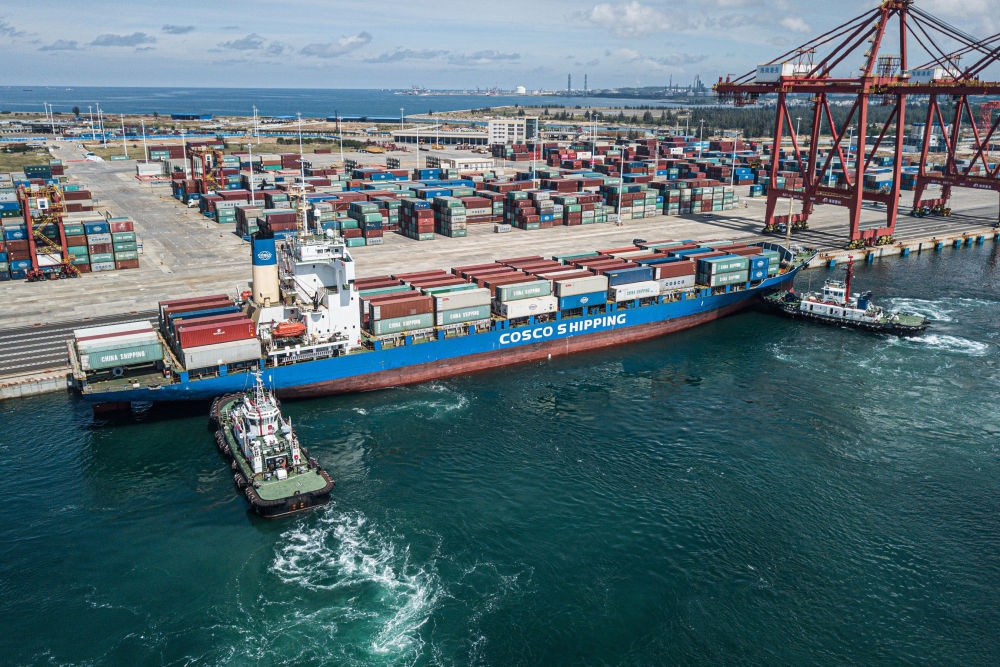 一艘中遠(yuǎn)海運(yùn)集裝箱貨輪在兩艘拖輪的輔助下,靠泊進(jìn)海南洋浦小鏟灘碼頭。記者 蒲曉旭 攝