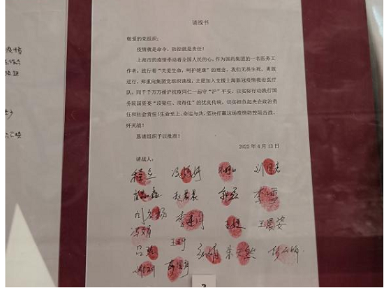 在身穿白色防護服醫(yī)護工作者人像的前方展臺上,展出了國藥集團援滬醫(yī)療隊醫(yī)護人員的請戰(zhàn)書。三年來,21萬國藥人,不計代價、不計成本、不計個人安危,義無反顧赴疫情最嚴重、防控最需要的崗位,勇敢肩負起守護人民生命安全和身體健康的使命職責(zé)。請戰(zhàn)書是新時代國藥人精神的鮮活體現(xiàn),是國藥集團黨組織發(fā)揮戰(zhàn)斗堡壘作用的具體實踐。
