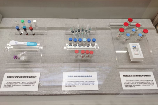 “方寸之間”展位的首排首個方柜,展出了以國藥集團中國生物新冠疫苗、奧密克戎株新冠疫苗為代表的抗病毒藥物,展現(xiàn)了國藥集團奮力推進科技創(chuàng)新,努力打造“國之重器”的傲人成績。
