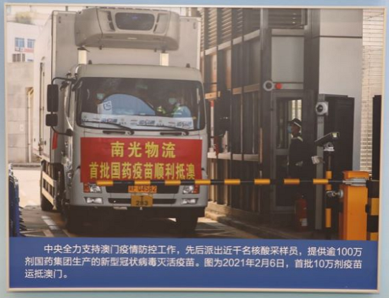 中央綜合展區(qū)第十單元“堅持‘一國兩制’ 推進祖國統(tǒng)一”澳門篇章,大幅圖片展現(xiàn)了首批10萬劑國藥集團新冠疫苗運抵澳門的情況,體現(xiàn)了國藥集團對鞏固內(nèi)地和澳門疫情防控成果、加快恢復(fù)澳門經(jīng)濟社會正常秩序的重要貢獻。