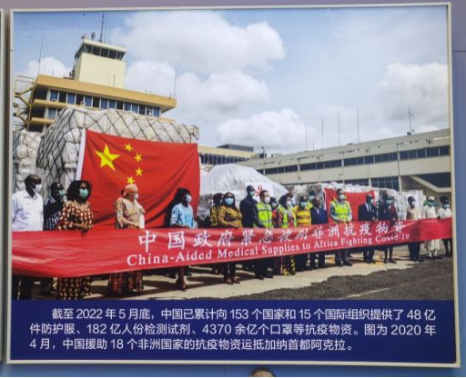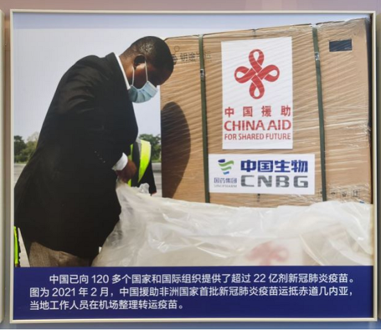 中央綜合展區(qū)第十一單元“外交工作”,展出了多幅國藥集團推進抗擊新冠肺炎疫情國際合作,執(zhí)行海外援助任務(wù)等助力構(gòu)建人類命運共同體的圖片。