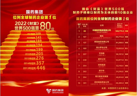 今年,在最新的世界500強排行榜中,國藥集團位列第80位,居全球制藥企業(yè)之首。而今年也是國藥集團連續(xù)入圍世界500強的第十個年頭。