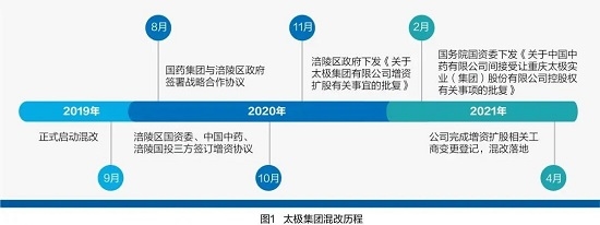 2021年4月15日,太極集團(tuán)完成增資擴(kuò)股相關(guān)工商變更登記,實(shí)際控制人由涪陵區(qū)國(guó)資委變更為國(guó)資央企國(guó)藥集團(tuán),混改成功落地(太極集團(tuán)混改歷程如圖1所示)。
