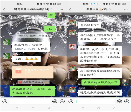 所有零售藥店堅(jiān)持正常運(yùn)營(yíng),不隨意關(guān)停。門店專門成立了藥品配送小組,在微信上建立了購(gòu)藥咨詢?nèi)?,每天早晨上班后,根?jù)顧客在群里發(fā)送的用藥需求,及時(shí)調(diào)配藥品,下午安排專人統(tǒng)一進(jìn)行配送。