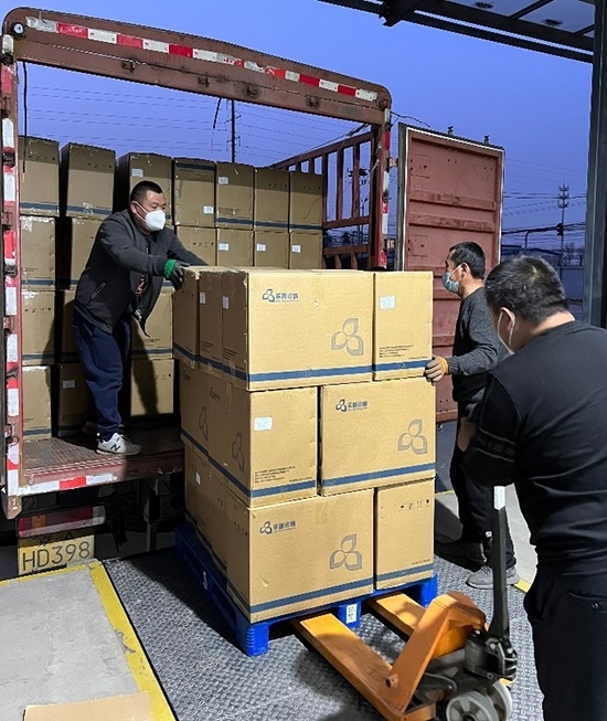 提貨地點(diǎn)在距離倉庫79公里的北六環(huán)外,凌晨1:52,集結(jié)車輛準(zhǔn)時(shí)出發(fā),凌晨3:10到達(dá)提貨地點(diǎn),還在發(fā)著燒的王學(xué)強(qiáng)馬不停蹄地指揮工人清點(diǎn)貨物、裝車封車,直到早晨6:12,裝滿兩輛大車的抗原試劑盒順利送達(dá)倉庫,等待卸貨入庫,截至早晨7:47全部商品完成入庫驗(yàn)收。