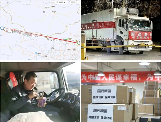 12月15日夜,國(guó)藥新疆一輛載滿(mǎn)10噸緊缺藥品和物資的載重貨車(chē)駛出烏魯木齊。50小時(shí),3012公里,人休車(chē)不休、星夜兼程,17日晚10時(shí)18分,醫(yī)藥物資順利抵達(dá)北京。